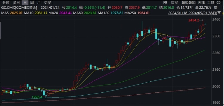 【环球网财经综合报道】据Wind数据显示,5月20日黄金、白银、铜价格纷纷继续刷新历史高点,特别是黄金现货一度站上2450美元/盎司,再创下历史新高。北京时间昨夜,国际贵金属期货普遍收涨,COMEX黄金期货涨0.53%报2430.3美元/盎司,COMEX白银期货涨2.55%报32.055美元/盎司。